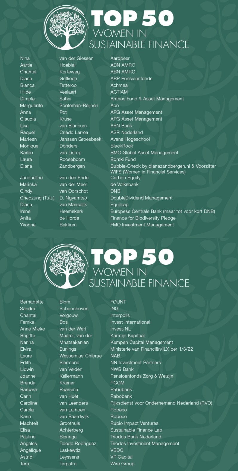 The Top 50 highlights female leaders in the Netherlands who are committed to sustainability within the financial sector. The list has been compiled annually since 2021.